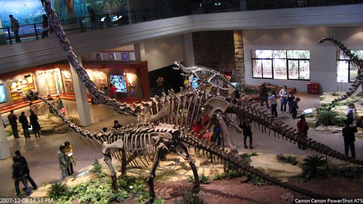 进到大厅,看到的是有数米之高的马门溪龙,还有李氏蜀龙的骨骼化石,李氏蜀龙,应该是个姓李的发现的吧,我还以为它姓李那,一家子诶,呵呵。