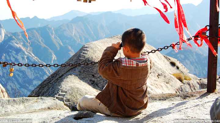 翌日,观东峰日出,毕,登南峰,在极顶见卖金牌,买下,镌Jerry名于上,Jerry喜。看到“英雄之门纪念品领取处”的指示牌,告之Jerry,有登顶纪念品。到达领取处,得知只有从山门徒步到顶方有此资格,看着一旁充满期待眼神的Jerry,我试探的问工作人员,这个小家伙从北峰登此,也应有受此荣誉的资格吧。说不可,制度这样规定,有些不悦。后来听说工作人员看到Jerry露出了笑容,我想对于遵循制度的人,我应该表示尊敬,而不是过于苛责,制度或许有制度的不合理,可是对于执行者,尽职值得被尊敬。