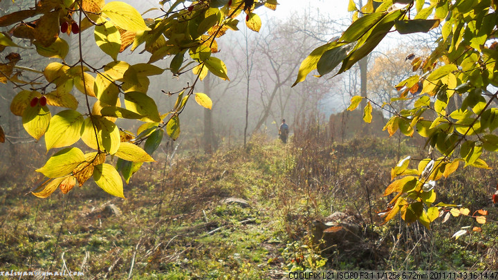 从这里才开始算得上爬山了,从地图上看等高线明显要密集很多,不到一人高的距离就已经看到Jimmie的脚跟。我们都以为爬到顶端就可以到达垭口,可是费了老半天劲,上去才发现还有一个大坡要上,就这样希望失望,失望希望中到达最高点海拔1900m左右的垭口,翻过垭口就是小峪河的山谷了。站在垭口上可以眺望山梁两边。我们停下来吃了些干粮,因为刚才耽误了些时间,就赶紧下山了,西边的山势明显要更陡一些,山下的树叶还没有完全变黄,而这里的树早已变得光秃秃了,树叶落了满地,没有人去顾及,也无需去顾及,就这样依偎在树的周围,慢慢的化为尘泥。而这时却因为这些树叶,让行进变得更加困难起来,我们不得不用双手紧抓两旁的树枝以确保自己不会摔倒。Paul开始落了些距离,原来10月他徒步到汉中一路伤了膝盖,现在疼的他每走一步都显的非常痛苦,Jimmie喷了些药,我们想如果赶不上末班车,我们就包个面的回去,所以慢慢走着,倒也悠哉游哉起来。