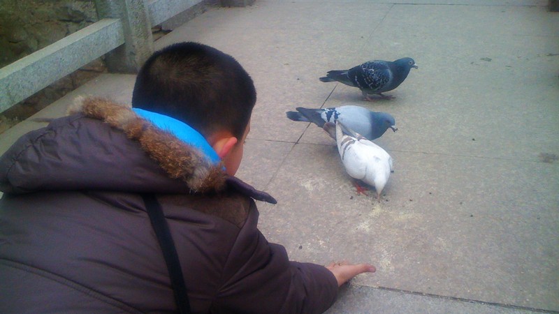 穿过前殿,看到大殿门前围了些人,上前一看原来是僧人在念经。从正殿右侧过来,是一片小空地,突然我们发现了在一个桥上停了几只鸽子,我们过去,鸽子也不飞走,孩子却面露沮丧,原来我们带的准备分享给鸟儿的饼干因为没有见到鸟被我们两个给瓜分了。这时发现旁边有些饼干碎屑,于是兴奋的拾了起来,弄碎了,放在鸽子面前,鸽子也认真的吃了起来。