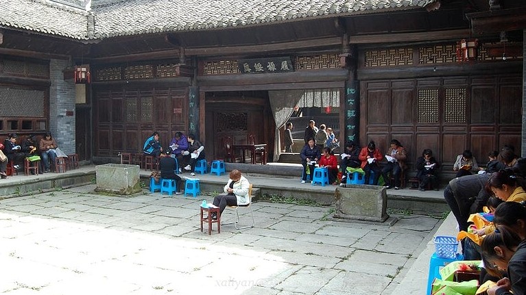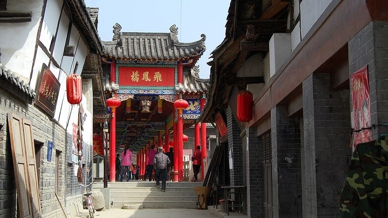 接着,我们一起去魏辅唐的宅院。宅院分老宅和新宅,要收门票20元。从新宅进去,从一个小门跨过去就来到老宅,老宅大院里做了很多婆姨,像是在绣花,其中一个阿姨让妻帮她在绣品上写过名字。一问原来是镇上让她们来这里学习绣花,每个学员要把自己的名字绣上的,有的觉得自己的字写的不好所以想让帮个忙。绣的素材大都是花,在一旁还坐着两个姑娘,穿着绣着相同花样的服装,姑娘讲,这是羌绣。