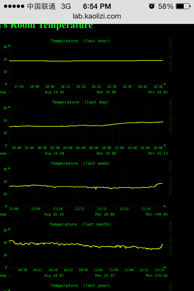 天冷了,房间里的暖气感觉一直不是很暖和。最近在搞cacti,对时序数据库rrd做了一些了解。在cacti里面根据历史数据可以根据刻/时/日/周/月/年的粒度来绘制历史图表。由于将数据进行了压缩,可以用很小的文件存储数年的历史趋势数据。所以就想用rrdtool来给室内温度做个曲线,来看下这个室温的历史曲线。