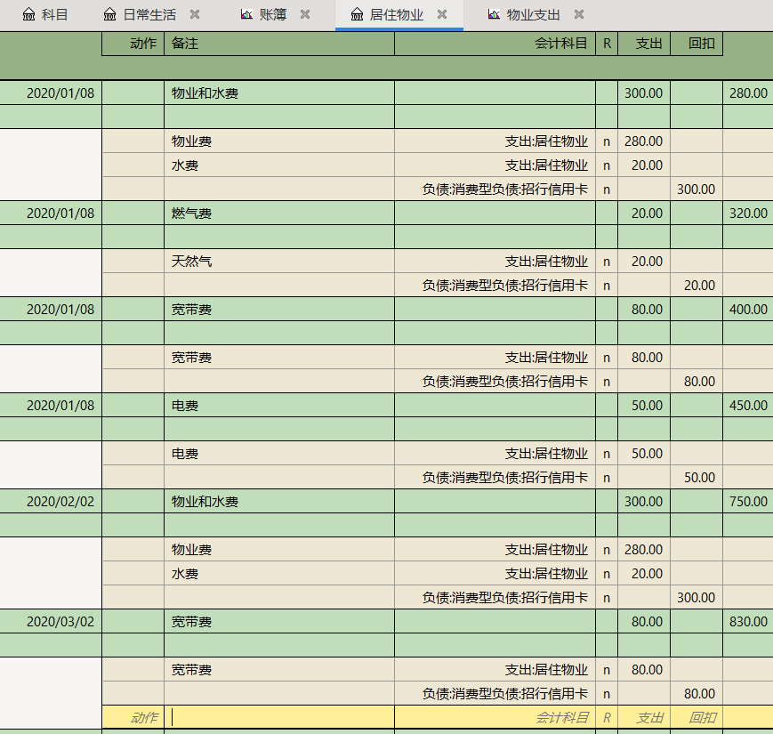 由于我们希望在报表中单独分出水费的部分,所以虽然从信用卡的账单上是一笔300元的支出。但是需要人为的将这笔支出分别用两个备注关键字来区分而不是分别记录到两个子科目下。这样也非常灵活,如果下一年不想在关注单独的水费的支出时候,就只需要将两个分项合并为一项就可以了。在这里备注的功能有点类似tag,tag作为一种逻辑层的组织形式其灵活性不言而喻。