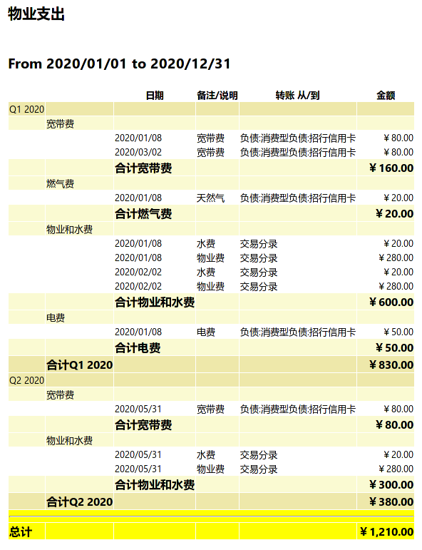 这样就可以做到在一个大类下按照手工输入描述和备注来做到不调整科目结构的情况下灵活区分某一特定类型的交易。比如有一些一次性的项目的支出,全部可以计入到其他支出,但是通过这种方式在对其他支出中的交易根据描述来做汇总,汇总也可以支出按月,季度和年,非常灵活,特别是配合正则的条件过滤,不能再舒爽。